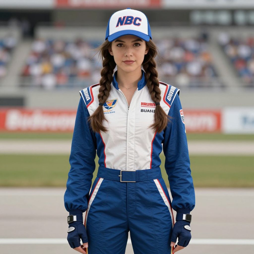 Photograph of a young woman standing on a racetrack, wearing a blue and white racing jumpsuit with red stripes, and a white NBC cap. She has long, dark brown hair in two braids and a serious expression. Her jumpsuit has various sponsor logos, including "Herbalife" and "Toyota." She wears black gloves and stands with her arms by her sides. The background shows a blurred crowd in the stands and a grassy area. The image has a bright, outdoor lighting with clear skies. The overall style is realistic and vividly detailed.