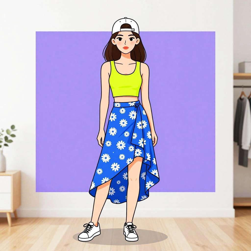Digital drawing of a young woman in a yellow crop top, blue floral skirt, white cap, and white sneakers, standing against a purple square background in