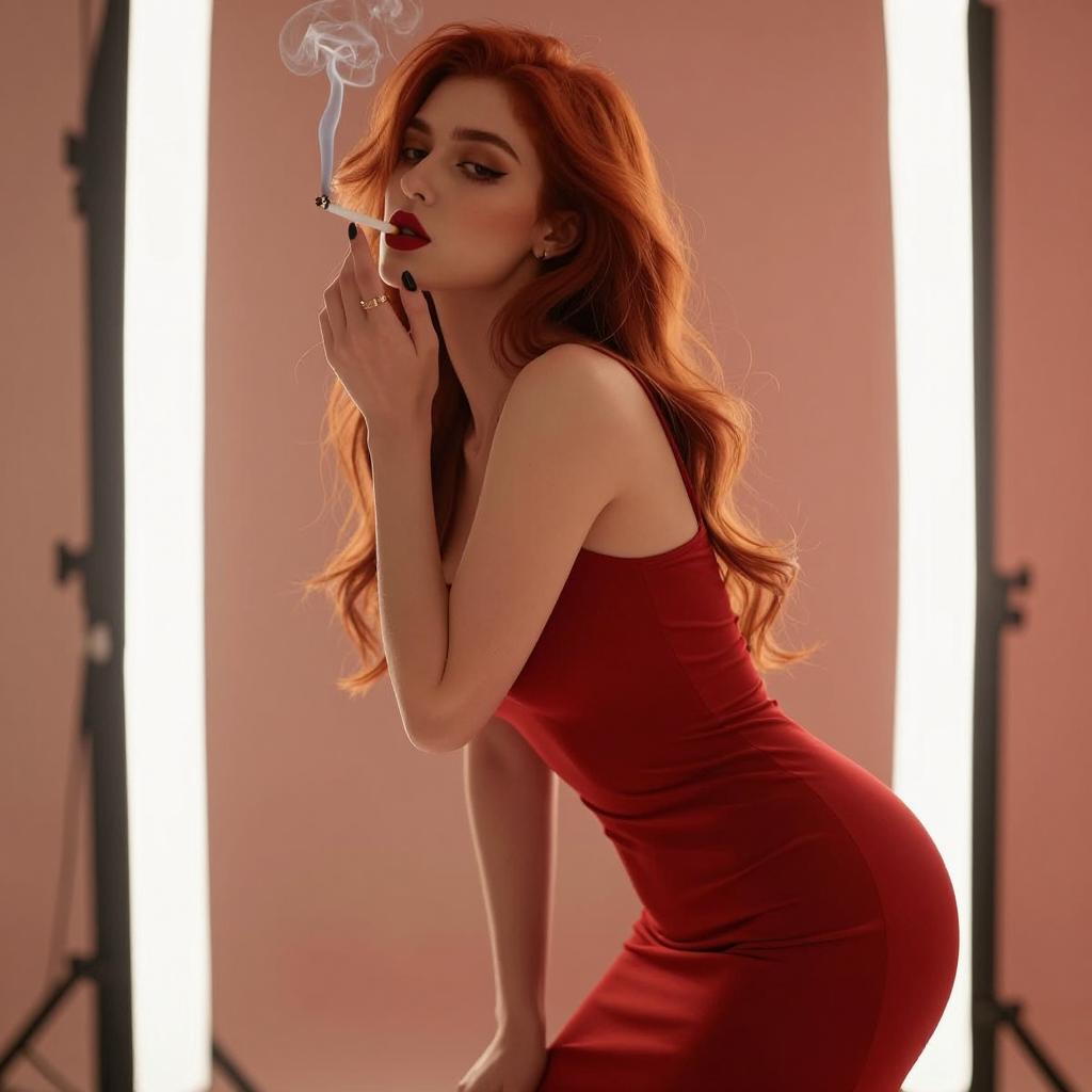 Photograph of a woman with long brown hair, wearing a black latex dress and gloves, holding a cigarette with red smoke. She stands in a dimly lit room, looking over her shoulder with a serious expression. Background includes a dark couch and ornate wall decoration. One person.