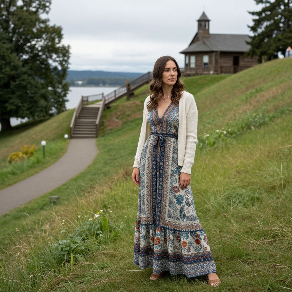 Woman wearing a bohemian floral maxi dress and cream cardigan stands gracefully on a grassy hillside at Fort Vancouver National Historic Site in Washington, with a scenic overlook featuring a pathway, stairs, and a historic structure in the background.
