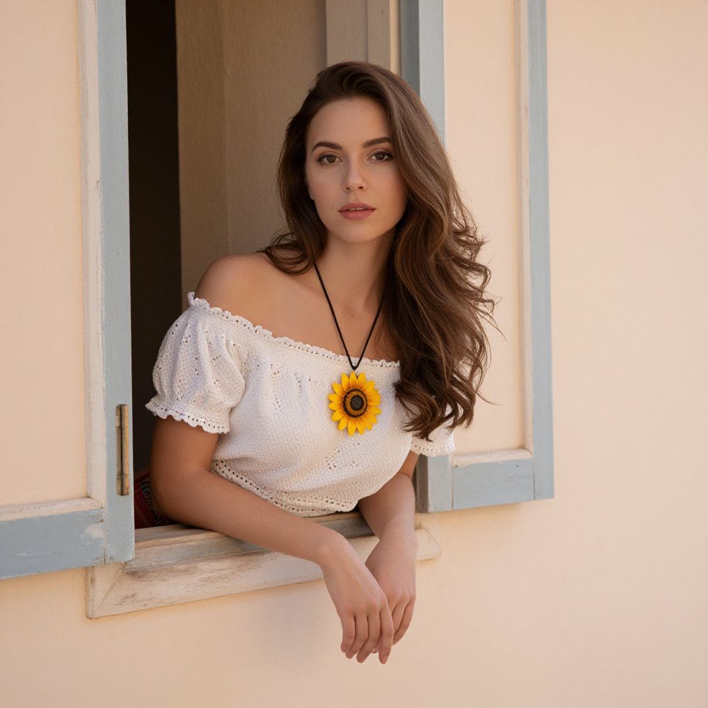 Woman leaning gracefully by a rustic window, adorned in a delicate off-the-shoulder white ruffled top, complemented by a sunflower pendant necklace, her long wavy hair cascading over her shoulders against a soft, pastel-hued wall.