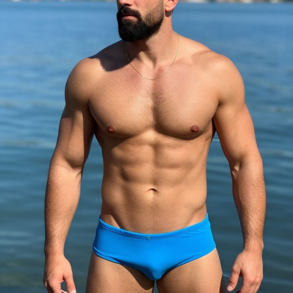 Photograph of a muscular, bearded man with light skin wearing bright blue swim briefs, standing by a clear blue sea, sunlight highlighting his defined