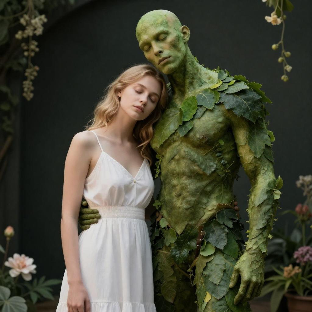 Photograph of a young woman with blonde hair and a white dress, leaning against a tall, bald man with a green, leafy, humanoid appearance. Man's right arm around woman's waist, both with relaxed expressions. Background includes dark, ured walls with flowers and foliage. Woman's eyes closed, man's head slightly tilted.
