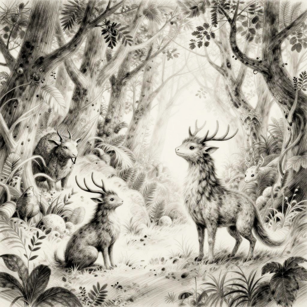 Sketch of a picture illustrating a whimsical forest scene with fantastical creatures, light pencil strokes blending with darker shading to create a mysterious ambiance, intricate tree branches and foliage surround the mythical animals in a detailed monochrome style.
