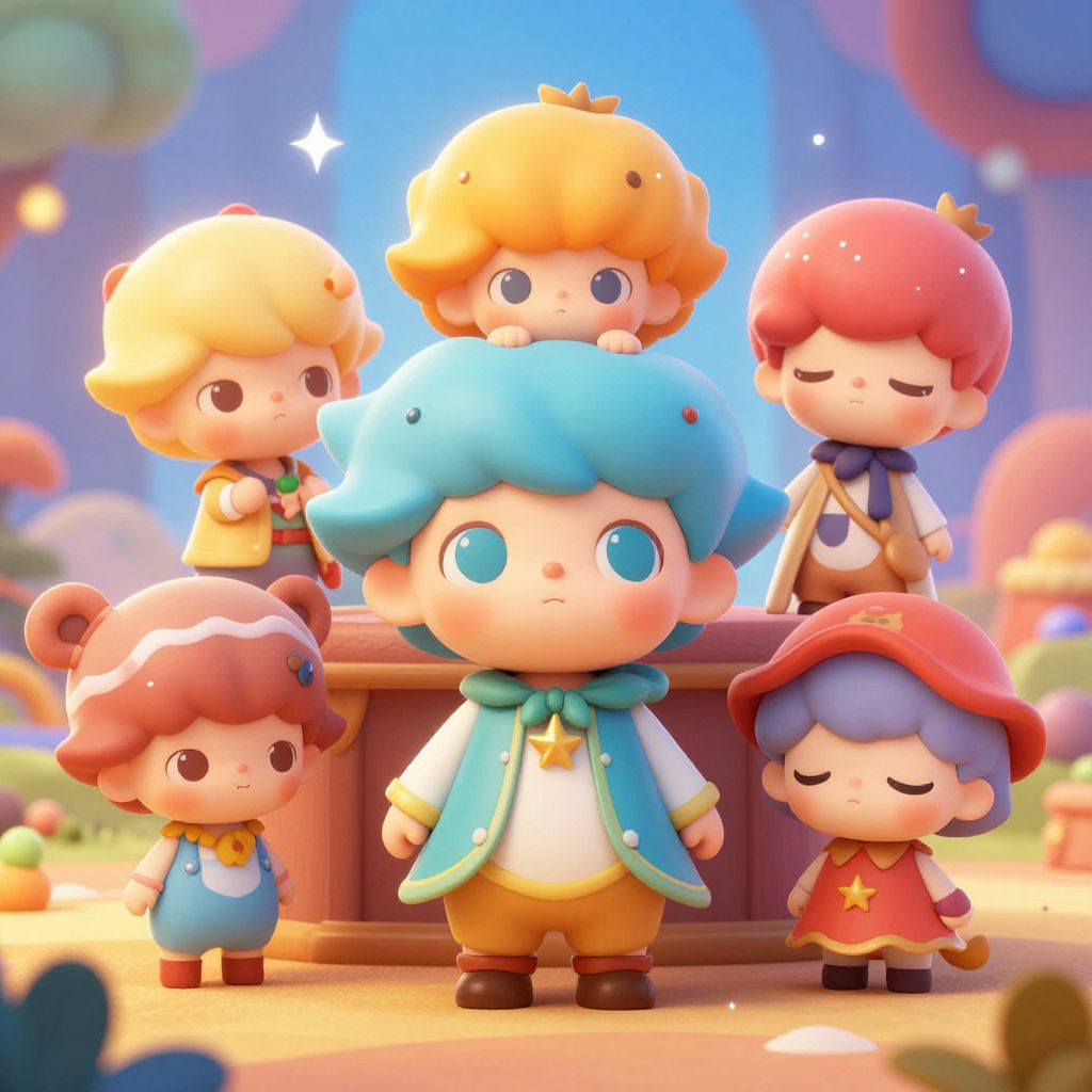 Character creator chibi concept art, small adorable characters with oversized heads, bright and colorful, wearing fantasy costumes, whimsical setting with sparkling effects, soft textures, cartoon-like style, creative and joyful atmosphere, detailed facial expressions