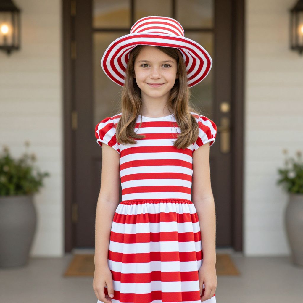 Photograph of a young girl with light skin and brown hair, wearing a red and white striped dress and matching wide-brimmed hat. She stands in front of a dark wooden door with glass panes and two gray potted plants on either side. The background features white siding and black lanterns. She has a gentle smile, and the sunlight enhances the vibrant stripes of her outfit. The overall style is casual and summery, with a focus on the bright, contrasting colors.