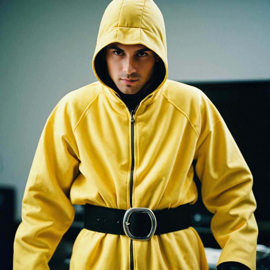 A young man wearing a bright yellow banana costume with a hood, featuring a black belt with a large silver buckle around his waist. The costume is realistic and covers his entire upper body, with the hood partially shadowing his face as he looks directly at the camera. The setting appears to be indoors with a neutral background.