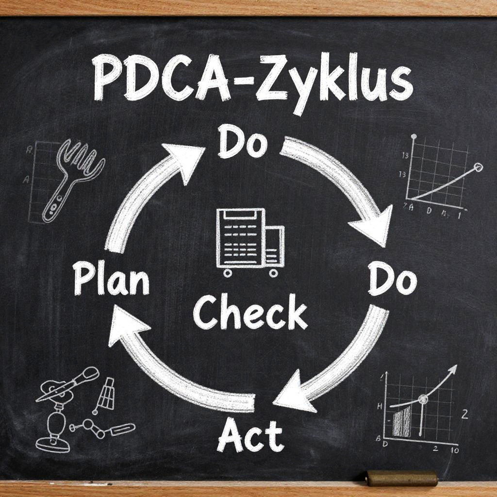 Illustration of the PDCA-Zyklus concept with hand-drawn style arrows and notes, showing the iterative cycle steps: Plan, Do, Check, Act on a chalkboard background, surrounded by sketches of tools and charts symbolizing quality management and workflow optimization