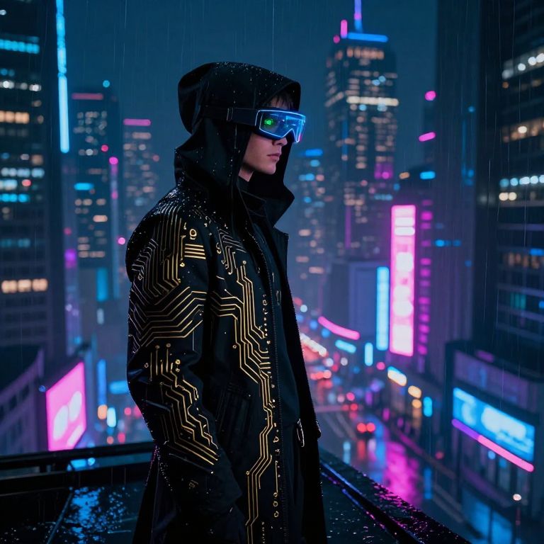 Imagine a night scene in a futuristic cyberpunk city, where neon lights with electric blue and deep magenta hues cast an otherworldly glow on rain-drenched streets. A cloaked figure stands atop a skyscraper, their sleek black attire adorned with gold circuitry patterns exuding both sophistication and menace. From a low perspective, the camera captures this enigmatic character's profile, revealing piercing green eyes under a hood that conceals their face. The scene is filled with tension as they scan the cityscape through a high-tech heads-up display in their visor, suggesting an unseen conflict or mission within this gritty, dystopian environment.