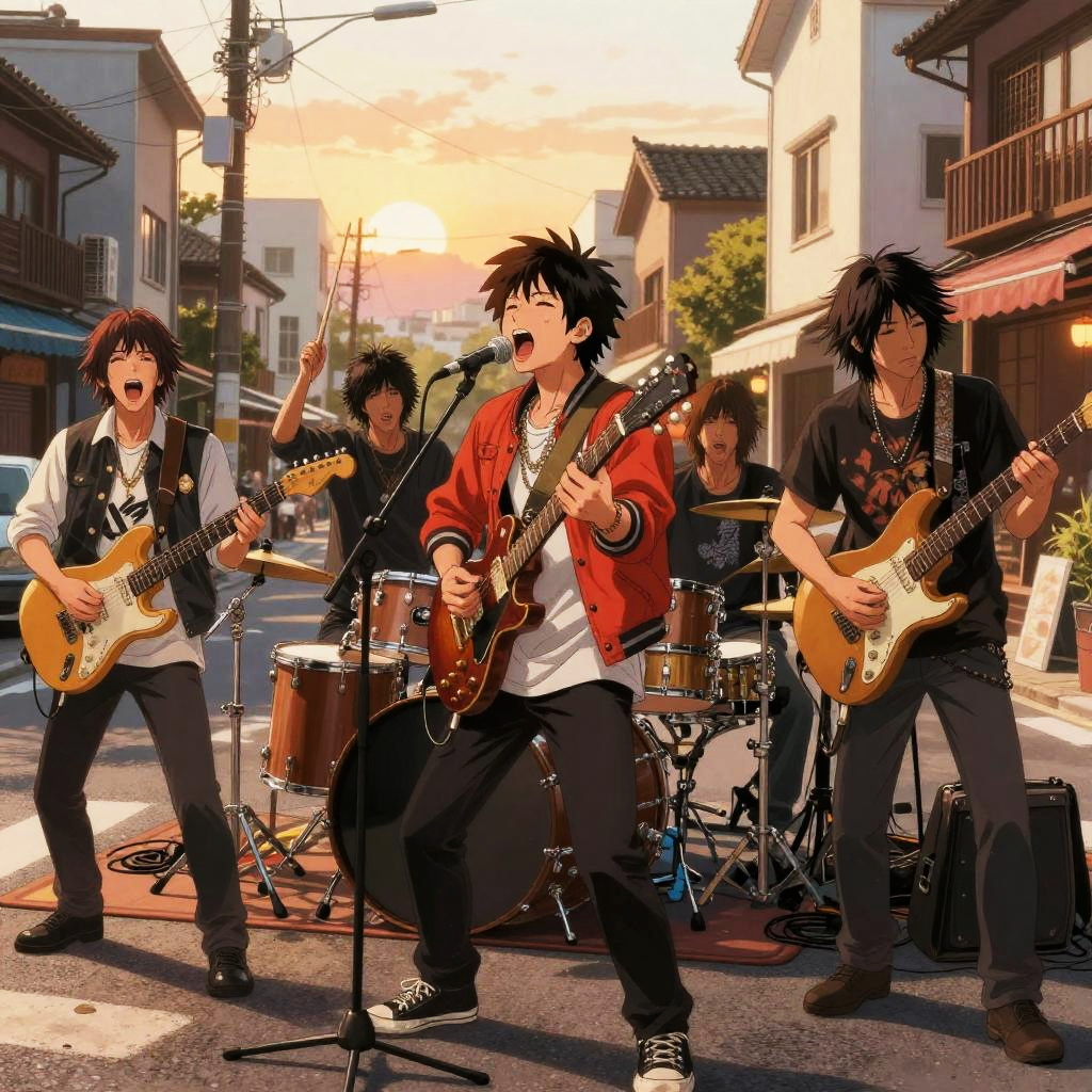 Realistic photo.a band of musicians, wearing eclectic outfits with instruments, gathered on a lively street corner at sunset, expressing passion, drawn in the intricate and nostalgic manga style of Naoki Urasawa. realistic photo