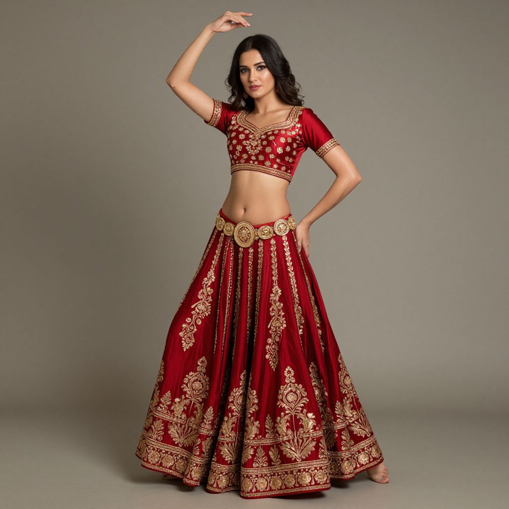 Woman wearing a vibrant Bollywood-inspired dance costume featuring a rich red silk top with gold embellishments, a matching skirt adorned with intricate floral patterns, and a detailed belt, poised gracefully against a neutral backdrop.