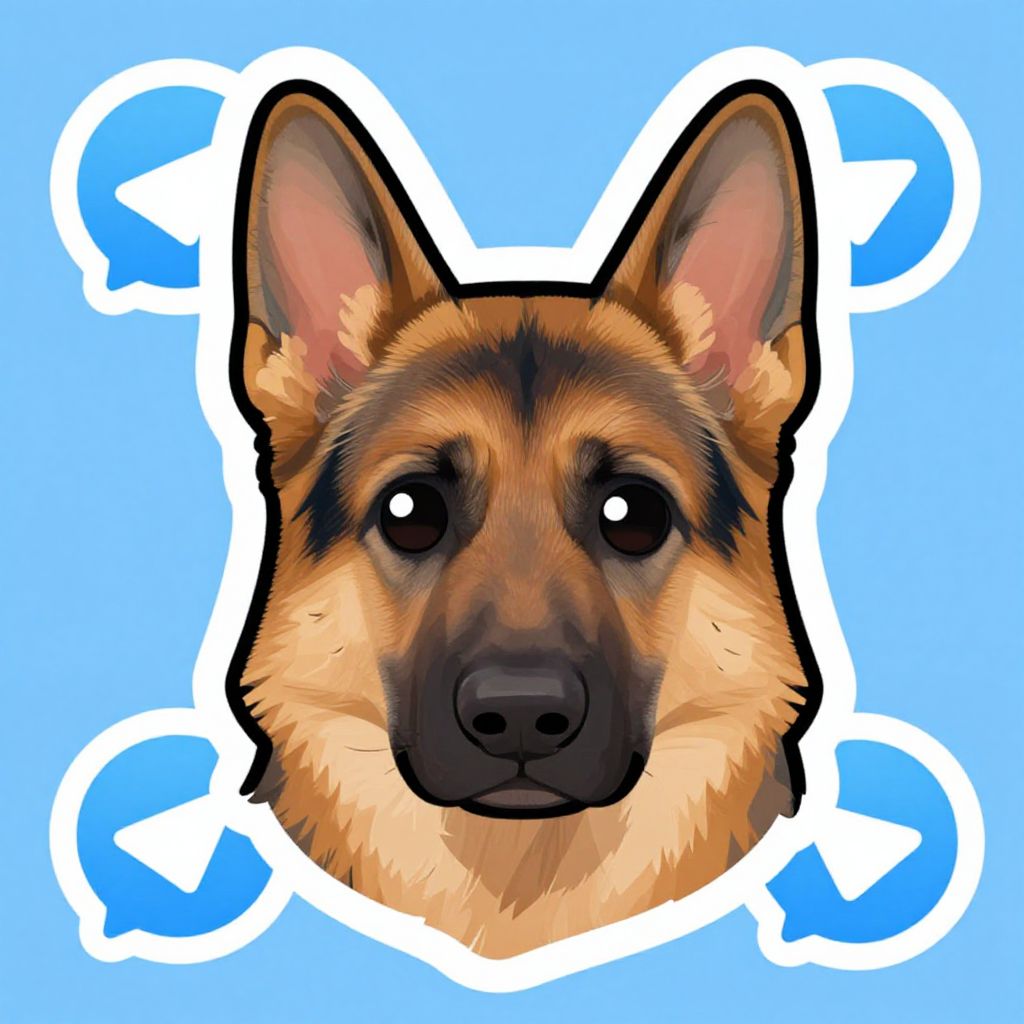 Digital illustration of a German Shepherd's head against a light blue background. The dog's face is centrally positioned, showcasing its black and tan fur with a black snout, brown eyes, and upright ears. The illustration uses bold, thick black outlines and vibrant colors. Surrounding the dog's head are four white, roughly circular shapes with blue accents, giving a playful, sticker-like appearance. The background is uniformly light blue, creating a contrasting backdrop that highlights the German Shepherd's detailed features and expressive eyes.