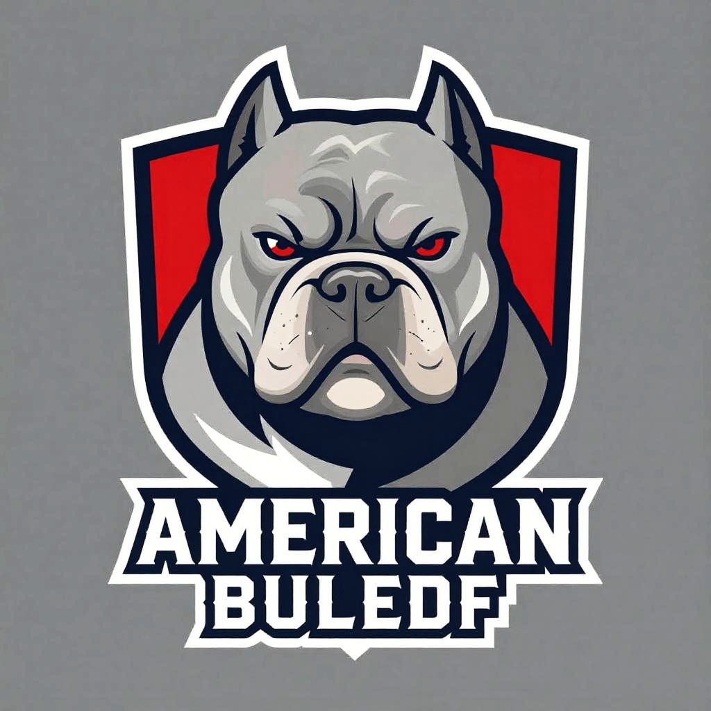 Digital illustration of a fierce, grey American Bulldog with red eyes, black nose, and stern expression, set against a red and black shield. Bold