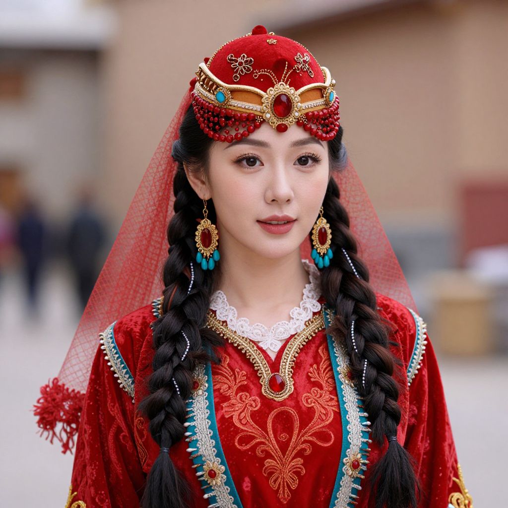 Photograph of an East Asian woman with fair skin and black braided hair, wearing an elaborate red traditional costume with gold and turquoise embroidery. She has a red headpiece adorned with gold and turquoise jewels, and a red veil. Her makeup is subtle, with natural tones. She wears large turquoise and gold earrings. The background is blurred, showing a beige building and indistinct figures, indicating an outdoor setting. The costume has intricate lace detailing at the neckline. The overall style is richly decorative and traditional.