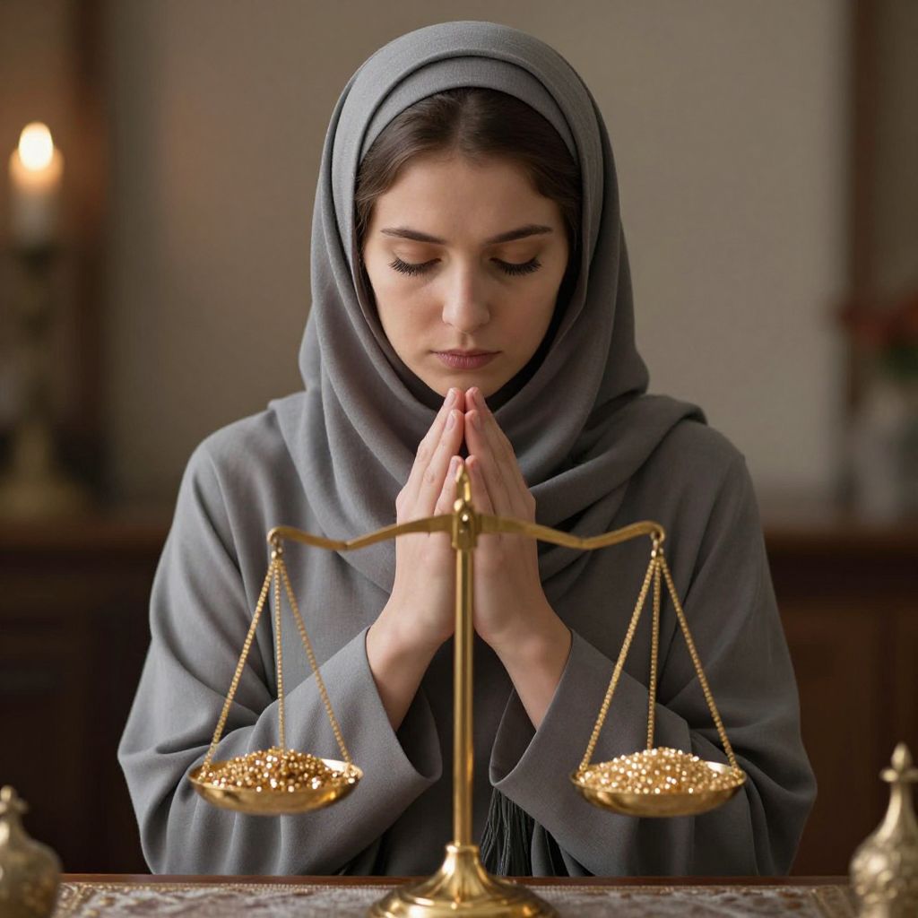 Photograph of a pensive young woman in a grey hijab and robe, hands in prayer, standing before a golden balance scale with grains. Soft