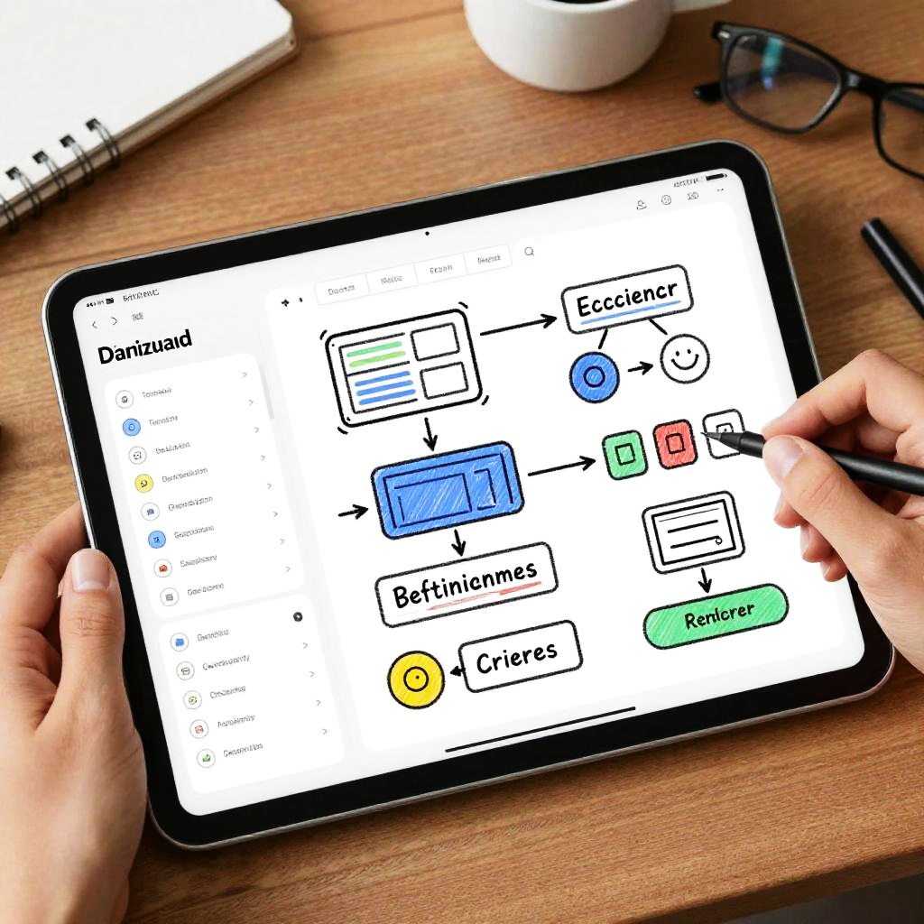 Uizard-inspired digital sketchpad showing UI components and flow diagrams, hand-drawn style combined with digital effects, warm natural lighting, workspace with creative tools scattered around, empowering app design and brainstorming process