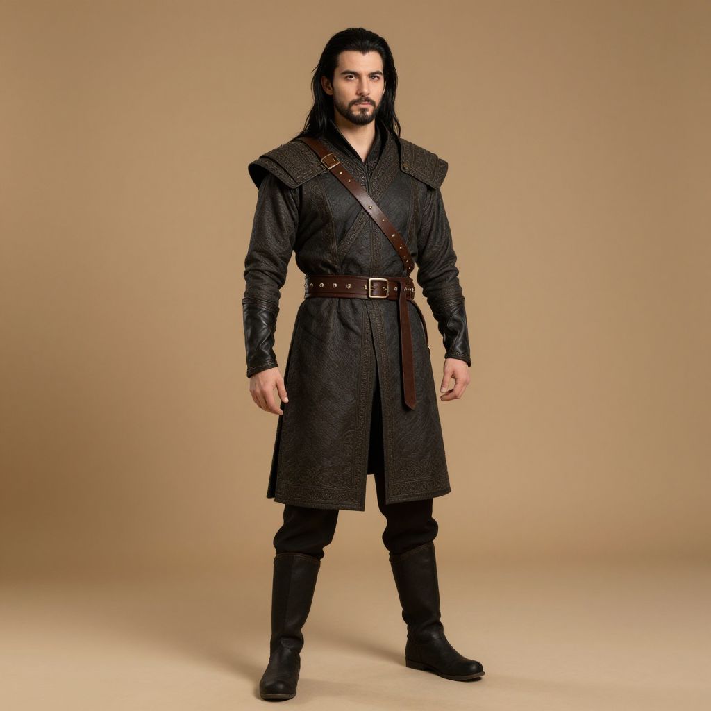 Photograph of a tall, dark-haired man with a beard, standing against a beige background. He wears a long, black, medieval-style coat with padded shoulders, a brown leather belt with a gold buckle, and black pants. A brown leather strap crosses his chest. He has black boots and his hands are relaxed at his sides. His expression is serious, and he gazes slightly to the right. The lighting is even, highlighting the textures of his clothing and the sheen of his boots. The overall style is reminiscent of fantasy or historical medieval attire.