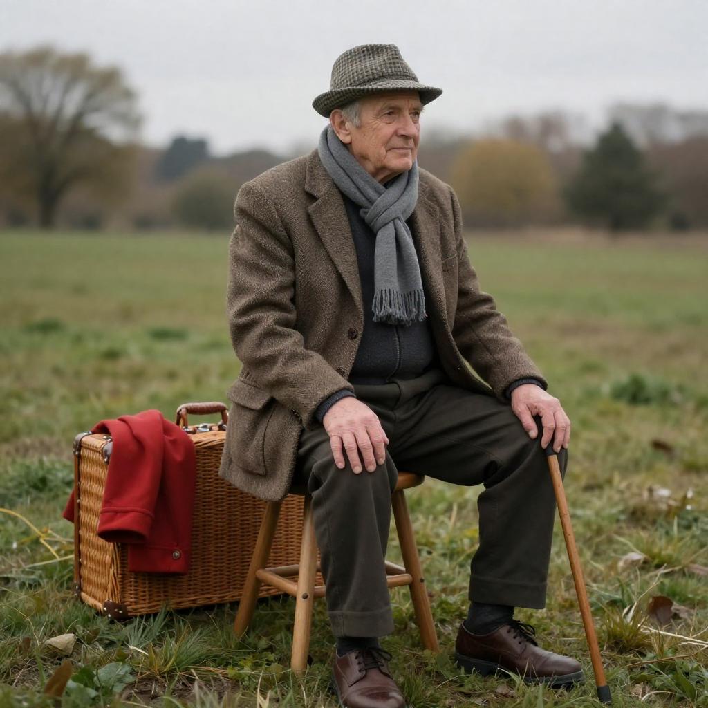 Photograph of an elderly white man with short white hair, wearing a green flat cap, black suit, white shirt, and brown tie. He gazes to the right with a serious expression. The background is blurred, with muted, industrial tones. The lighting highlights his facial features and the ure of his cap.