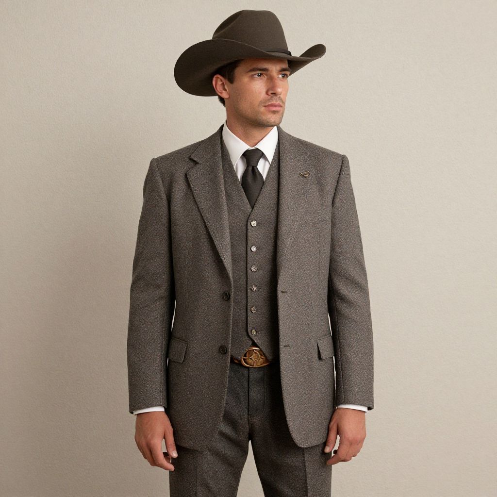 "Vintage Western Suit, man in a cowboy hat and vest standing in front of a wall"