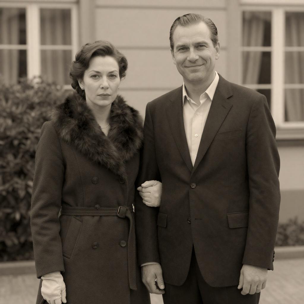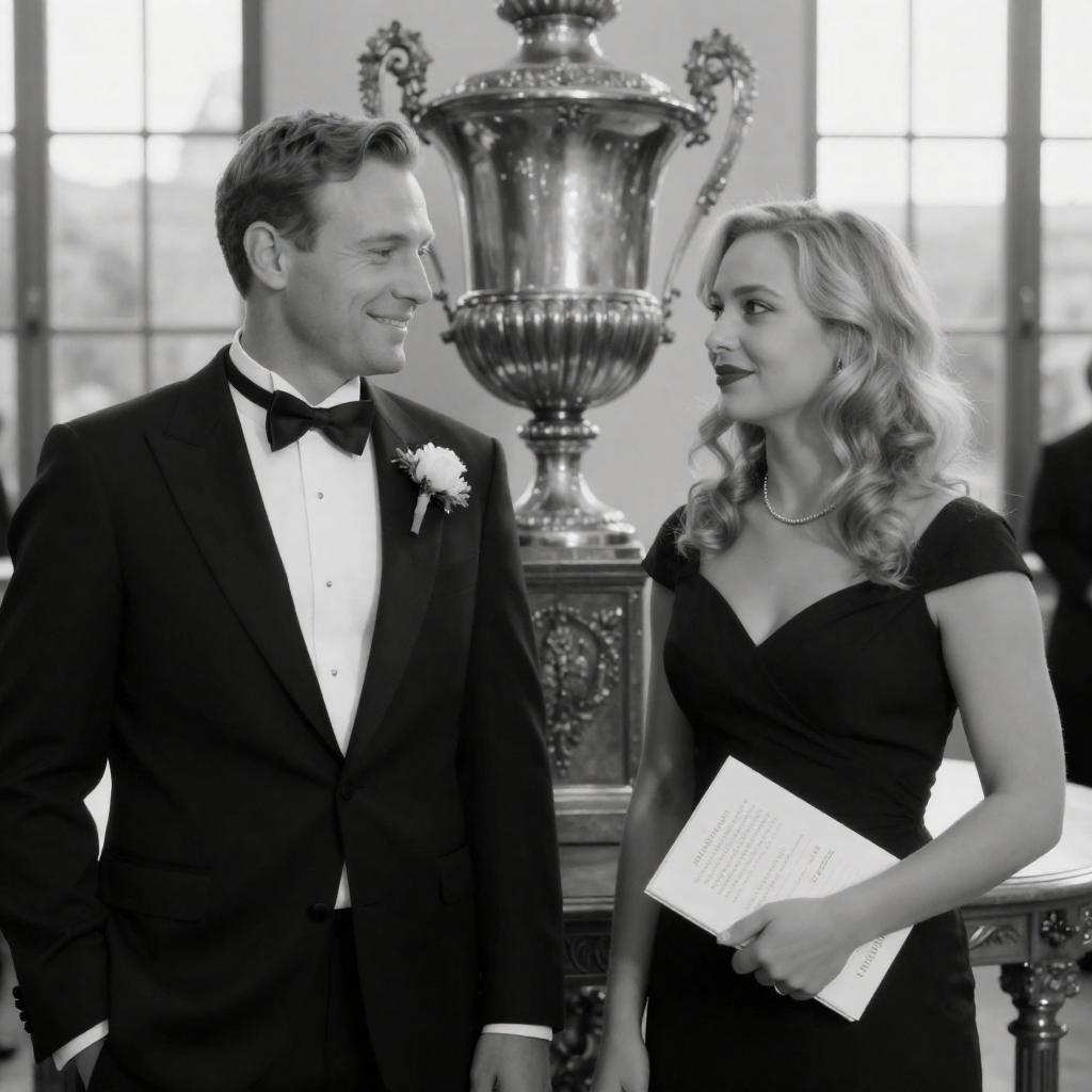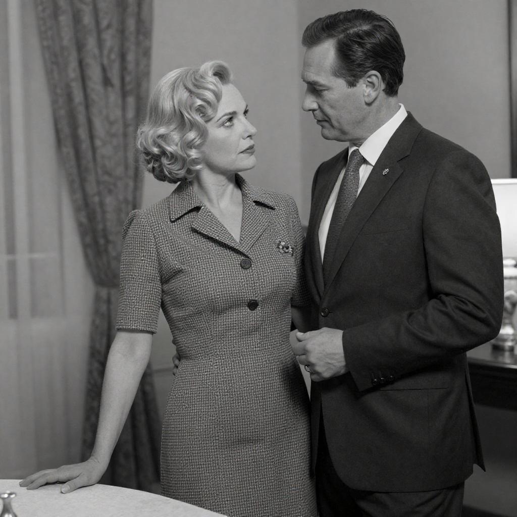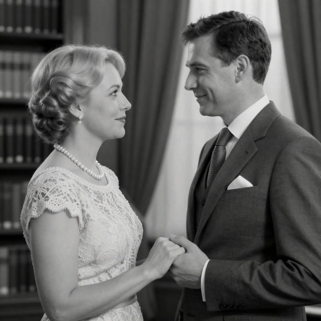Black and white photograph of a man and woman in a formal setting. Woman with short, blonde bob haircut, pearl necklace, and lace dress. Man with short, dark hair, suit, tie, and pocket square. Woman looks at man with a slight smile, man looks at woman with a slight smile. Library background with bookshelves and curtains. Man's right hand gently holds woman's left hand. Woman's left arm is visible. Both subjects are close together, facing each other.