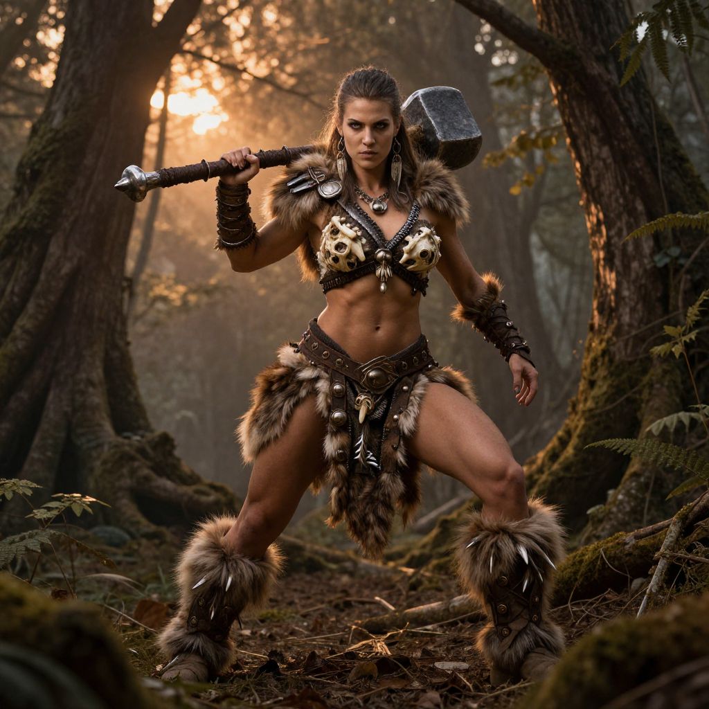 Barbarian woman art, muscular female warrior poised in a dense ancient forest, wielding a spiked club, adorned with fur and bone armor, fierce expression, dramatic shadows and warm sunset hues, fantasy epic style