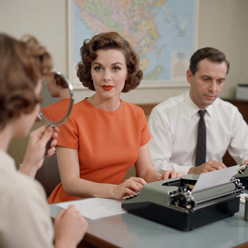 Black-and-white photograph of a 1950s-style woman with wavy dark hair, wearing a sleeveless white top and dark skirt, sitting at a desk with a lamp, books, and a typewriter. She gazes directly at the camera, with a curtain featuring a wavy pattern in the background.