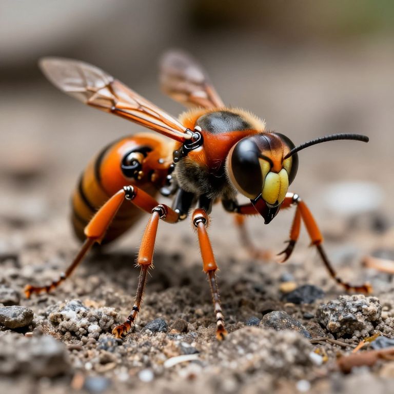 This is a close-up photograph of a vibrant, detailed wasp. The insect's body is predominantly orange with black stripes, and it has a fuzzy black and yellow face. Its large, black eyes and yellow mandibles are prominent. The wasp's transparent wings are slightly blurred, and its six legs are orange with tiny black tips. The background is a blurred, textured ground, with small pebbles and dirt visible, adding a natural setting to the image. The photograph is highly detailed, capturing the wasp's intricate features and colors with sharp clarity.