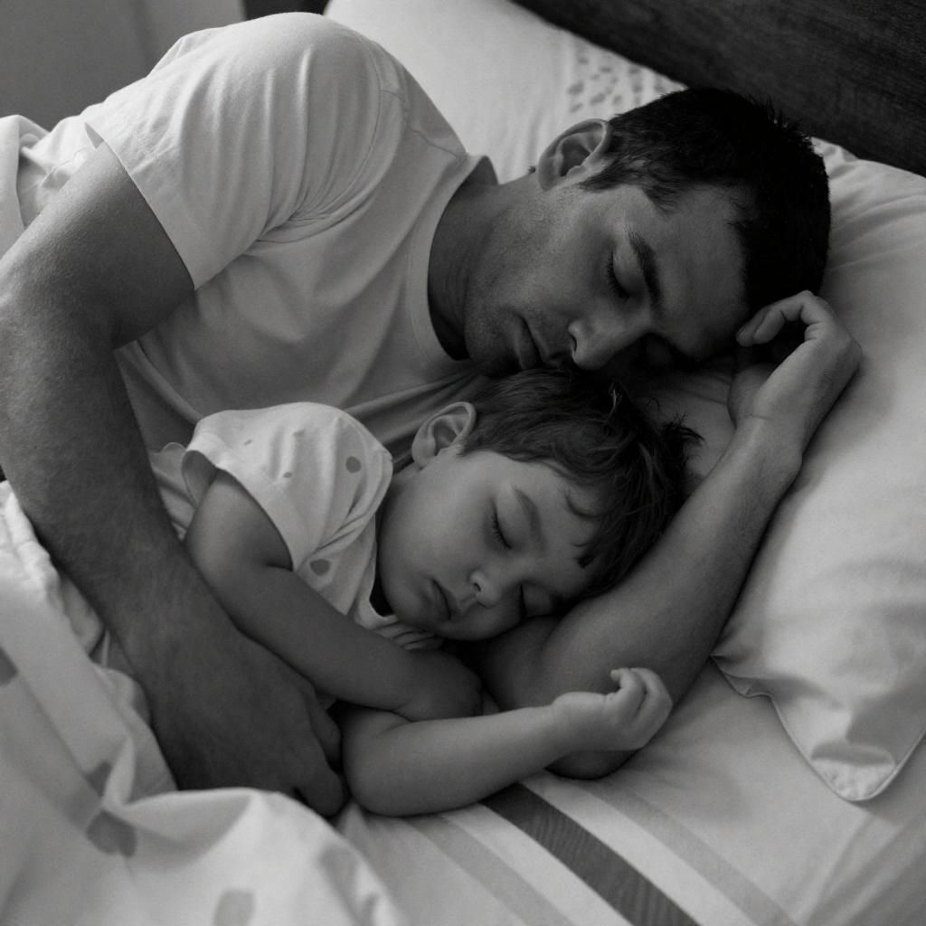 Black-and-white photograph of a man and a child sleeping closely on a striped bed. Man's head rests on child's arm, child's eyes closed. Man in light shirt, child in light clothes. Man's left hand on child's head. Bed has patterned blanket. Both have peaceful expressions.