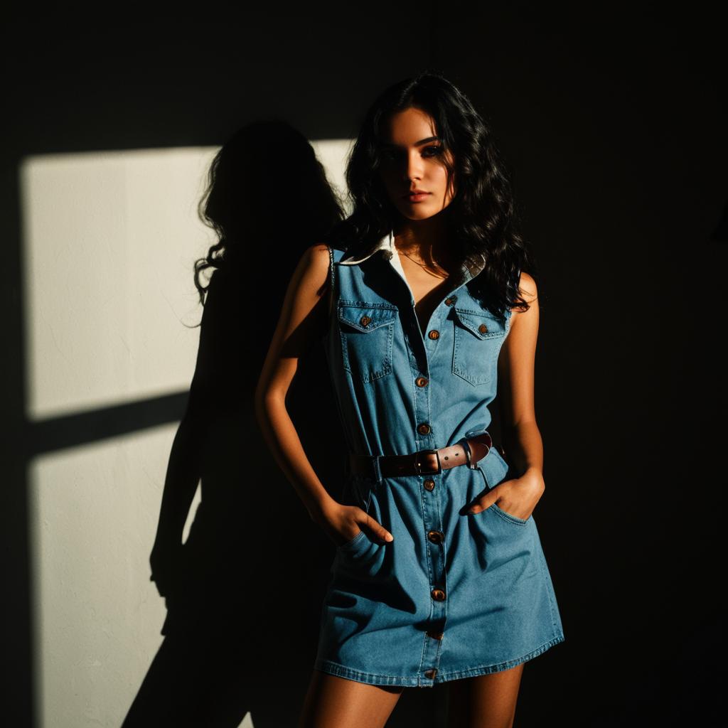 Portrait of a teenage woman with wavy black hair standing indoors in warm lighting. She is wearing a sleeveless denim mini dress with a pointed collar, front button fastening, two flap chest pockets, and a brown belt. The background is dark with shadows and diagonal light rays creating dramatic contrast.
