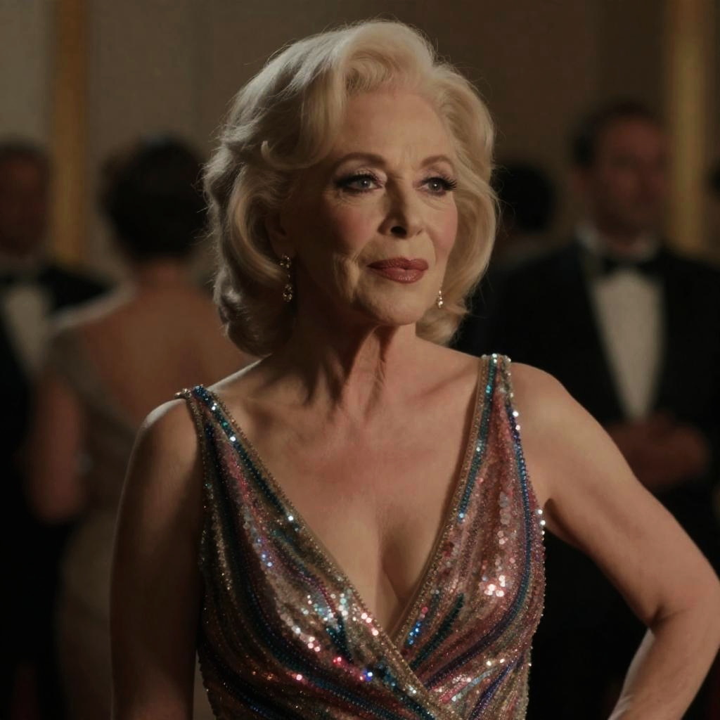 Kathleen Turner 70s, elegant retro portrait, natural lighting with soft focus, patterned wallpaper background, accessorized with large hoop earrings and vintage sunglasses
