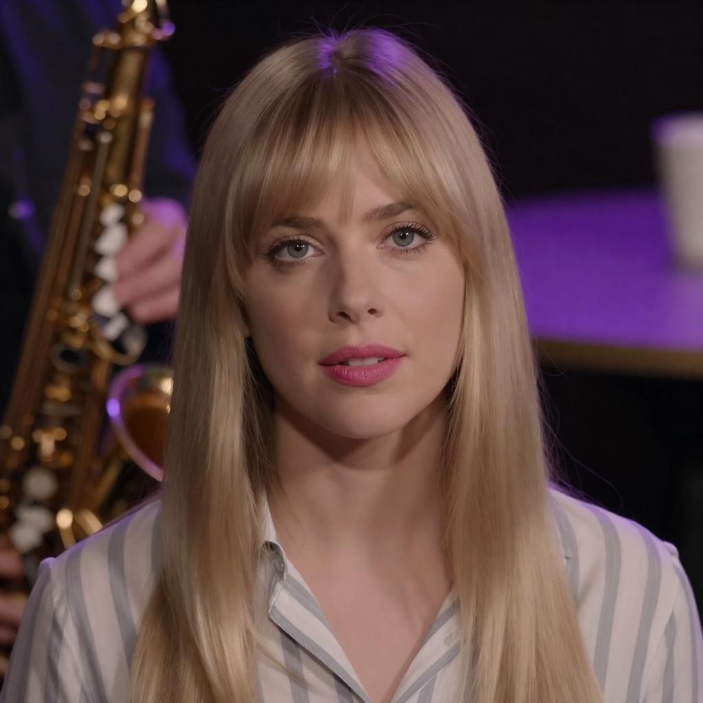 Photograph of a woman with long blonde hair, bangs, green eyes, and pink lipstick. She wears a striped shirt, looking intently forward. Background includes a blurred saxophone and purple-lit table. Close-up shot.