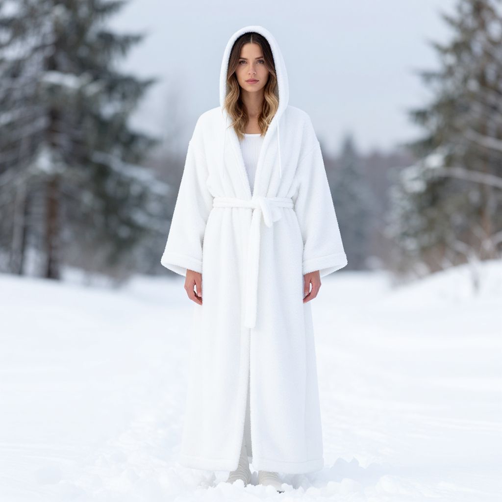"Snow White Clothing Adult, woman in a white robe and a white hoodie standing in the snow"