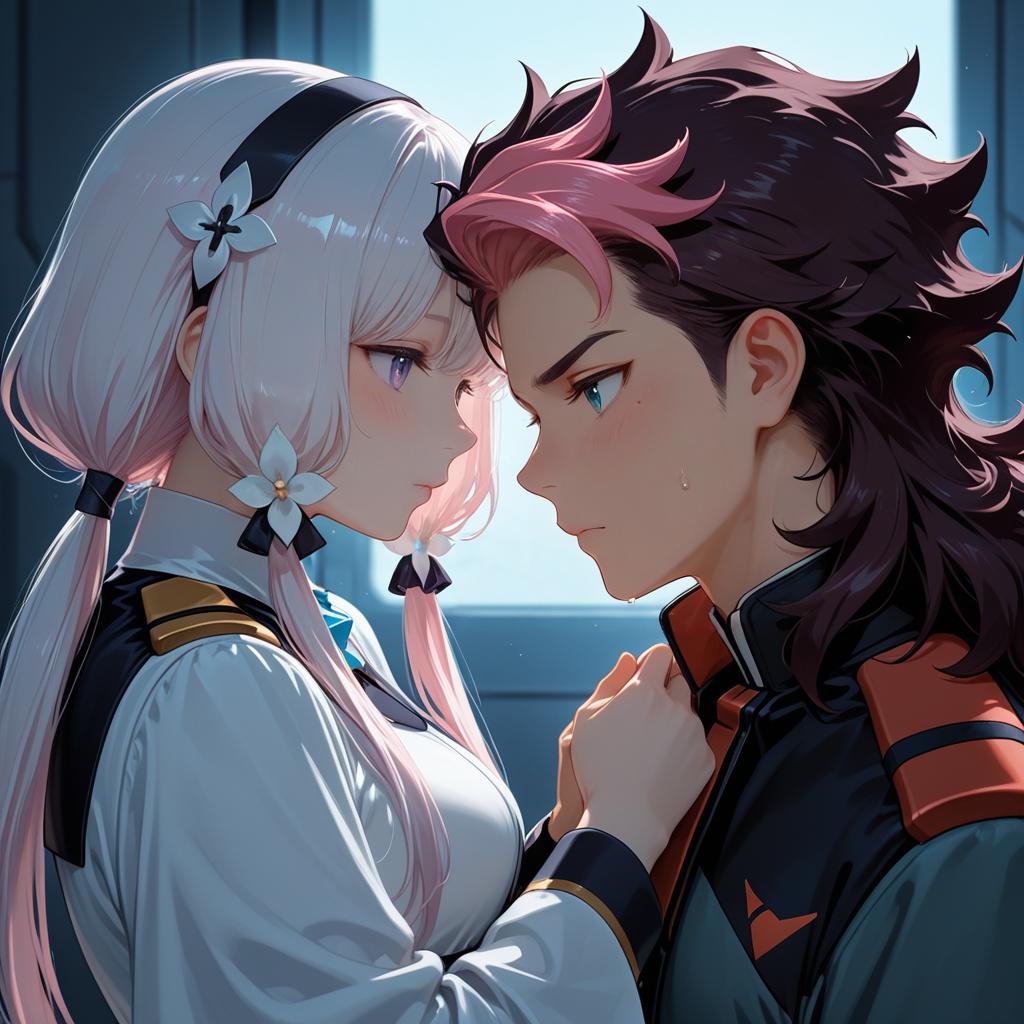 Digital anime-style artwork depicting a close-up intense moment between a young man and woman facing each other. The man has long dark hair with pink highlights, blue eyes, and wears a dark uniform with red and orange accents. The woman has long white hair with pink streaks adorned with hairpins shaped like flowers, violet eyes, and wears a white and black school uniform. Both characters show serious expressions, with the man holding the woman's hand near his chest. The background suggests an indoor setting with soft lighting. Artwork inspired by Gundam and styled by artist ica.