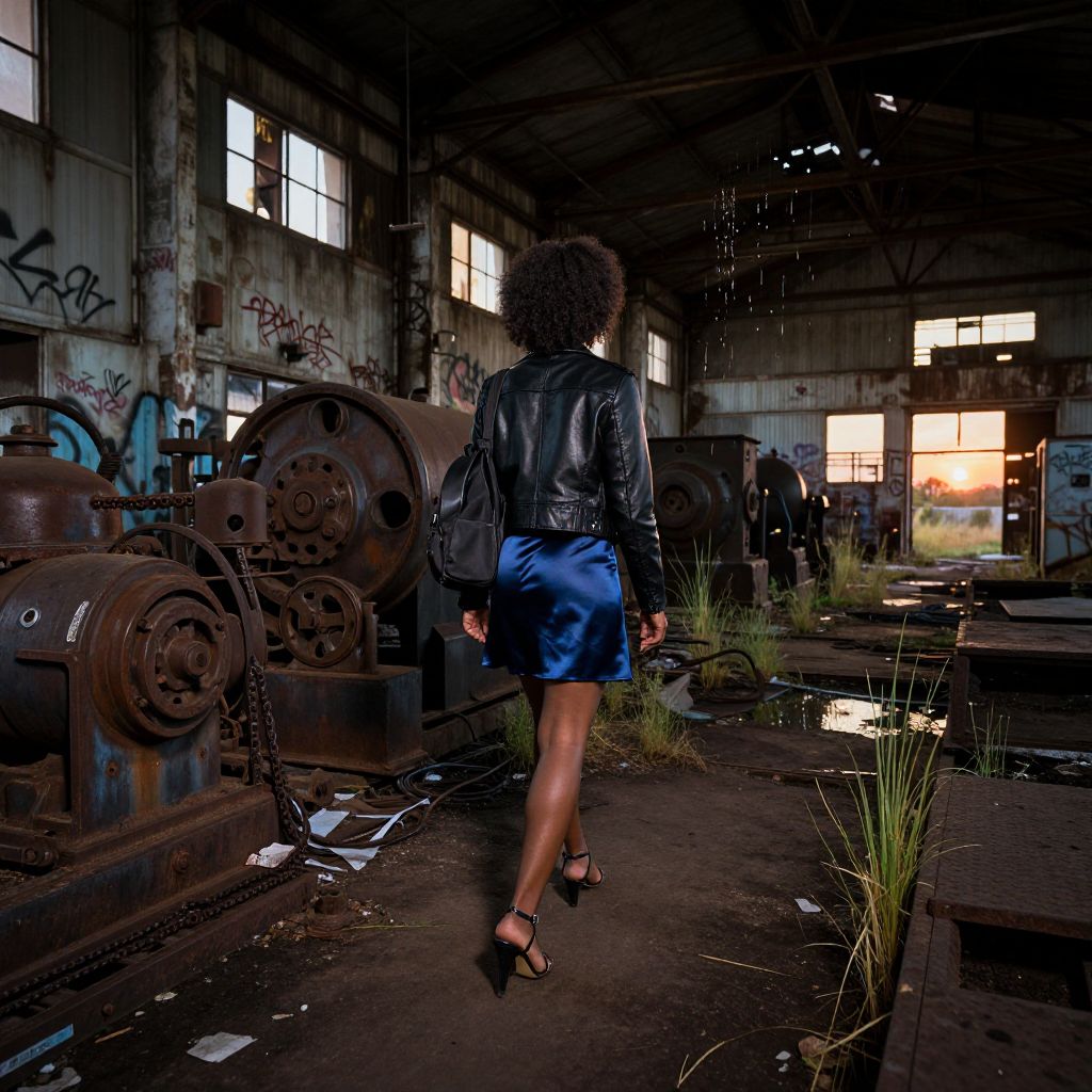 Photograph of a woman with curly black hair walking away in an abandoned industrial building. She wears a black leather jacket, blue knee-length skirt, and black sandals. The background features large, rusted cylindrical machinery, graffiti on the concrete walls, and broken windows letting in sunlight. Green grass and debris are scattered on the floor. The scene is dimly lit with natural light filtering through the windows, creating a contrast with her dark jacket and blue skirt. The overall atmosphere is gritty and urban.