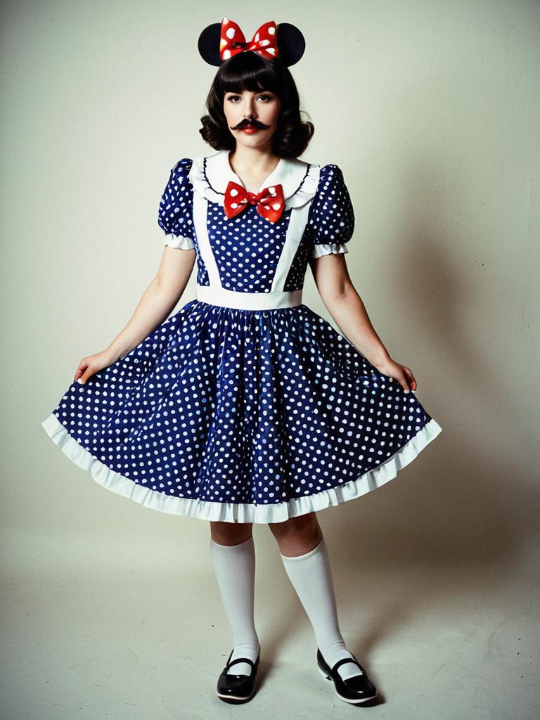 Minnie minors costume, solo, polka dot, dress, bow, polka dot bow, shoes, polka dot dress, cosplay, crossdressing, 1boy, hair bow, male focus, mustache, parody, standing, full body, realistic