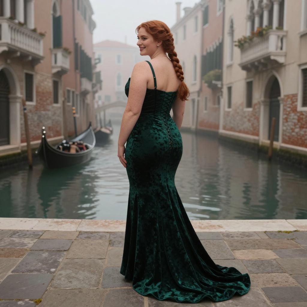 Masterpiece, best quality, (photorealistic:1.4), full body, ultra-detailed photo of a curvy auburn woman with long braided hair and freckled skin, wearing emerald-green velvet corset gown with lace-up back and a flowing train, standing in a fog-kissed cobblestone Venetian canal promenade at dusk, smiling with an hourglass silhouette, viewed completely from behind
