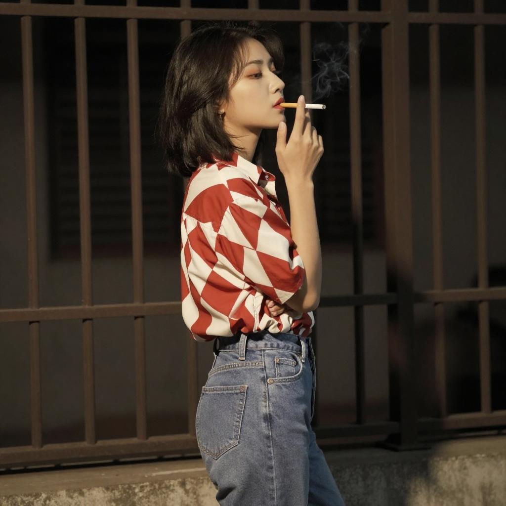 Photograph of a young woman with short black hair, wearing a red and white geometric patterned shirt and high-waisted blue jeans. She is standing in profile, holding a cigarette to her mouth with her right hand. The background is dark and industrial, with metal bars visible. The lighting is warm, highlighting her figure.