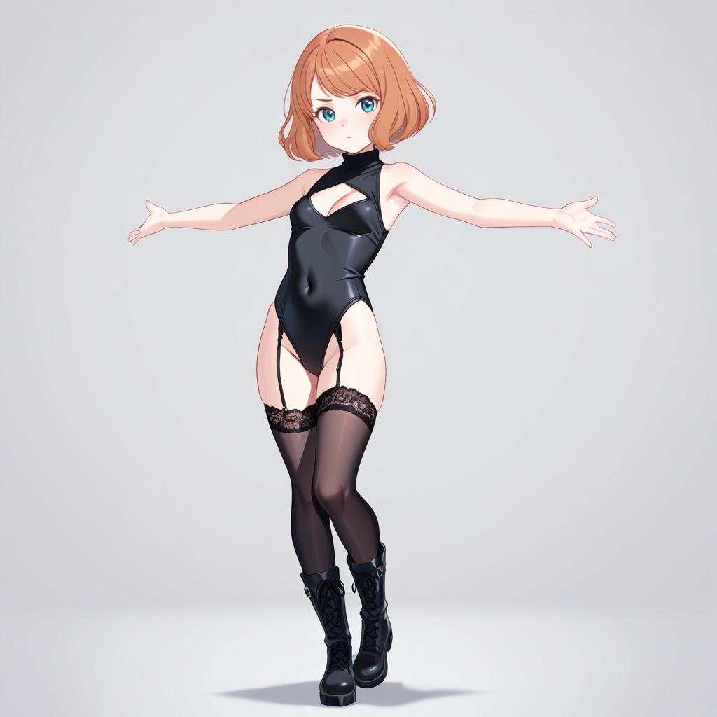 Full body, 1girl, solo, petite woman with light brown freckled skin, sandy colored wavy bob, and brilliant turquoise eyes gazing curiously, black highleg leotard with cleavage and clothing cutout, bare shoulders, covered navel, turtleneck, garter straps, black thighhighs with lace-trimmed legwear, boots, Arms wide open, soft eyes and gentle pout, soft diffused illumination, grey background