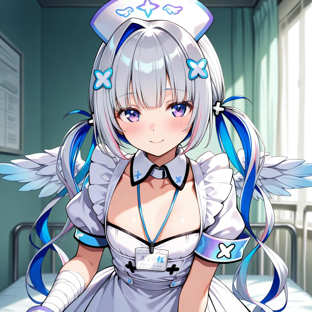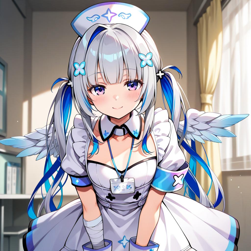 Amane kanata (nurse), hololive, 1girl, angel wings, angel wings, purple eyes, blue hair, grey hair, colored inner hair, single hair intake, official alternate hairstyle, streaked hair, official alternate hair length, long hair, pink hair, x hair ornament, twintails, blunt bangs, small breasts, flat chest, nurse cap, white gloves, white dress, white apron, detached collar, puffy short sleeves, virtual youtuber, virtual youtuber, feathered wings, feathered wings, nurse, nurse, bandaged arm, id card, armband, by artist gin (ginshari), illustrious