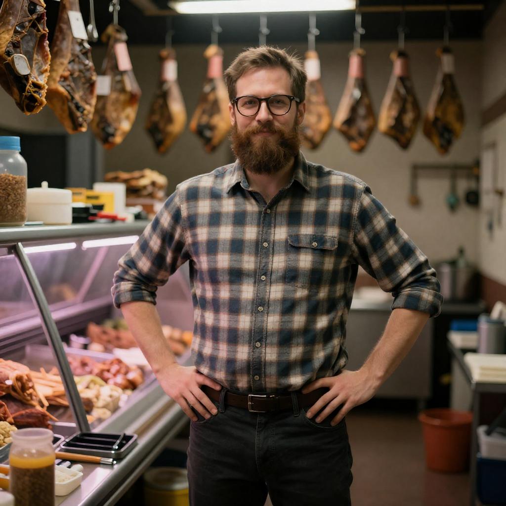 Bearded man with glasses, wearing a plaid shirt and dark pants, stands in a dimly lit butcher shop. Hanging cured meats are in the background. He has hands on hips, smiling slightly. Various tools and equipment are scattered around.