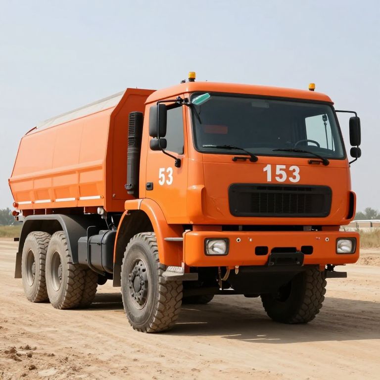 Photograph of a large, bright orange construction dump truck with "153" in white on the front and side. The truck has six black, rugged tires, a black grille, and rectangular headlights. The cab is boxy with a large windshield. The truck is parked on a dirt road with a clear, blue sky in the background. The truck's body is boxy and utilitarian, with the rear section slightly raised. The scene is bright and sunlit, emphasizing the truck's vibrant orange color and the texture of the dirt road.