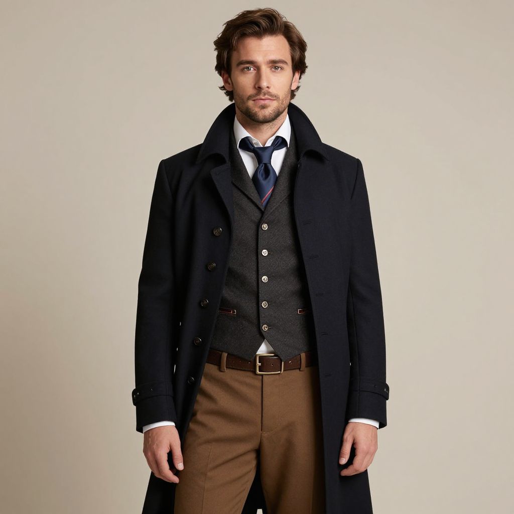 Photograph of a handsome Caucasian man with light brown, wavy hair and a neatly trimmed beard. He wears a dark navy overcoat over a charcoal gray waistcoat and white dress shirt, complemented by a dark blue tie. His brown trousers are belted with a brown leather strap. The background is a plain, light gray, highlighting his formal, sophisticated attire. His expression is serious and composed, with a direct gaze at the camera. The lighting is even, emphasizing the textures and colors of his clothing.