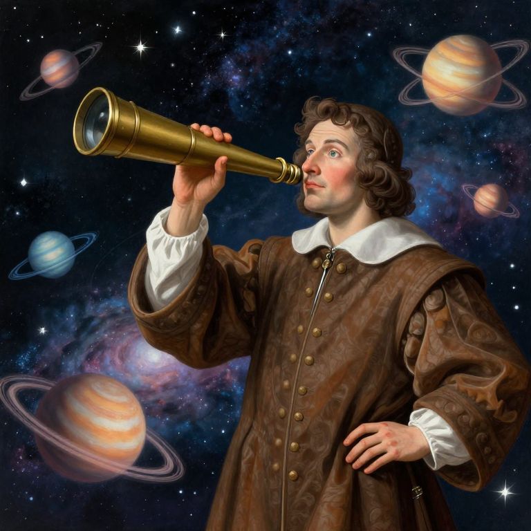 Galileu depicted in a realistic style holding a telescope, surrounded by planets and stars in outer space, a cosmic background with nebulas and galaxies, highlighting his contributions to astronomy in a vibrant and imaginative illustration.