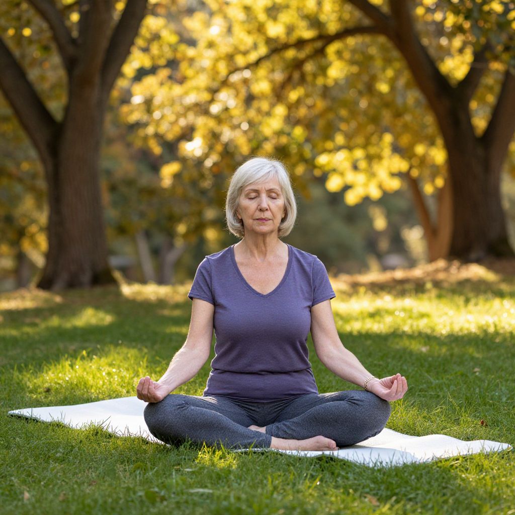 Senior woman meditating outdoors, seated cross-legged on a white yoga mat amidst a vibrant green lawn, surrounded by golden sunlight filtering through autumnal trees.