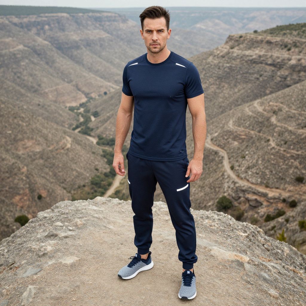 A man, slim-fit moisture-wicking t-shirt, lightweight stretch joggers, breathable mesh sneakers, color-blocked navy and gray, reflective details, rocky outcrop viewpoint, sweeping valley below, hand-tinted photograph, focused expression.Man has masculine face and piercing eyes