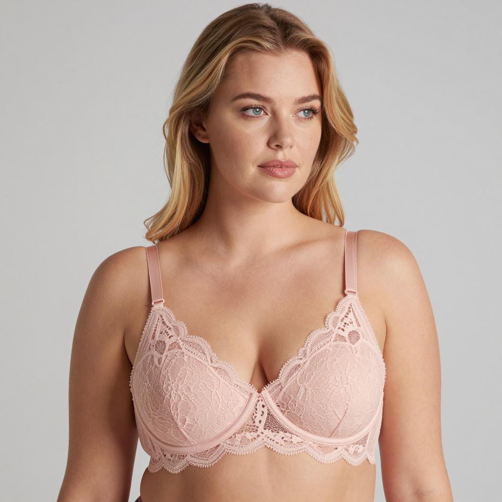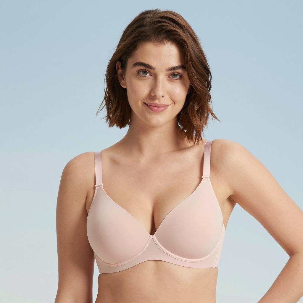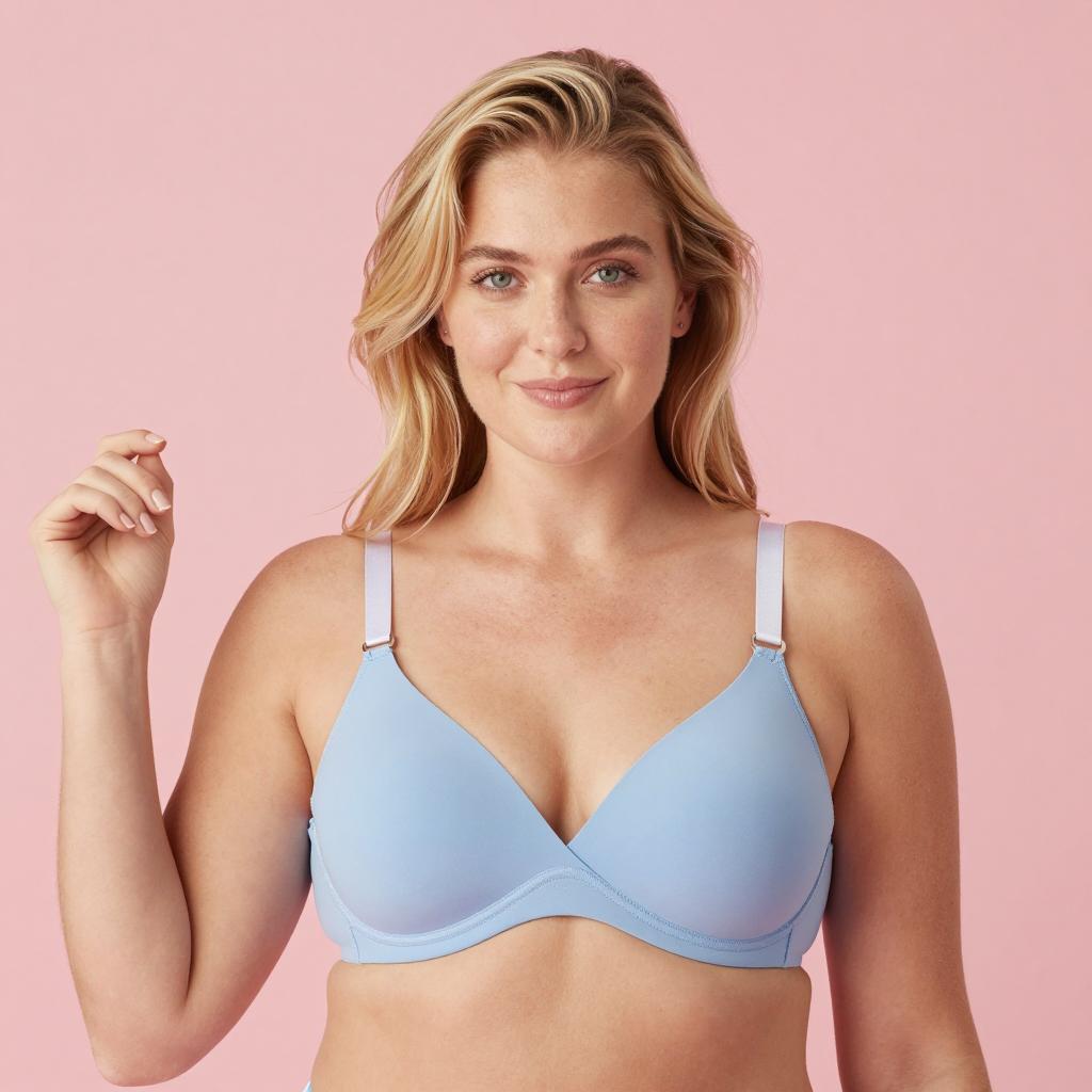 Photograph of a light-skinned woman with long, straight blonde hair, smiling slightly. She wears a light blue bra with white straps, revealing medium-sized breasts. She stands against a solid pink background. Her right arm is slightly raised.