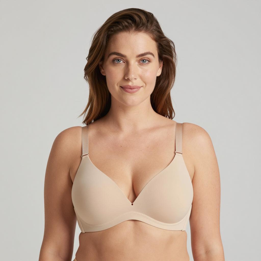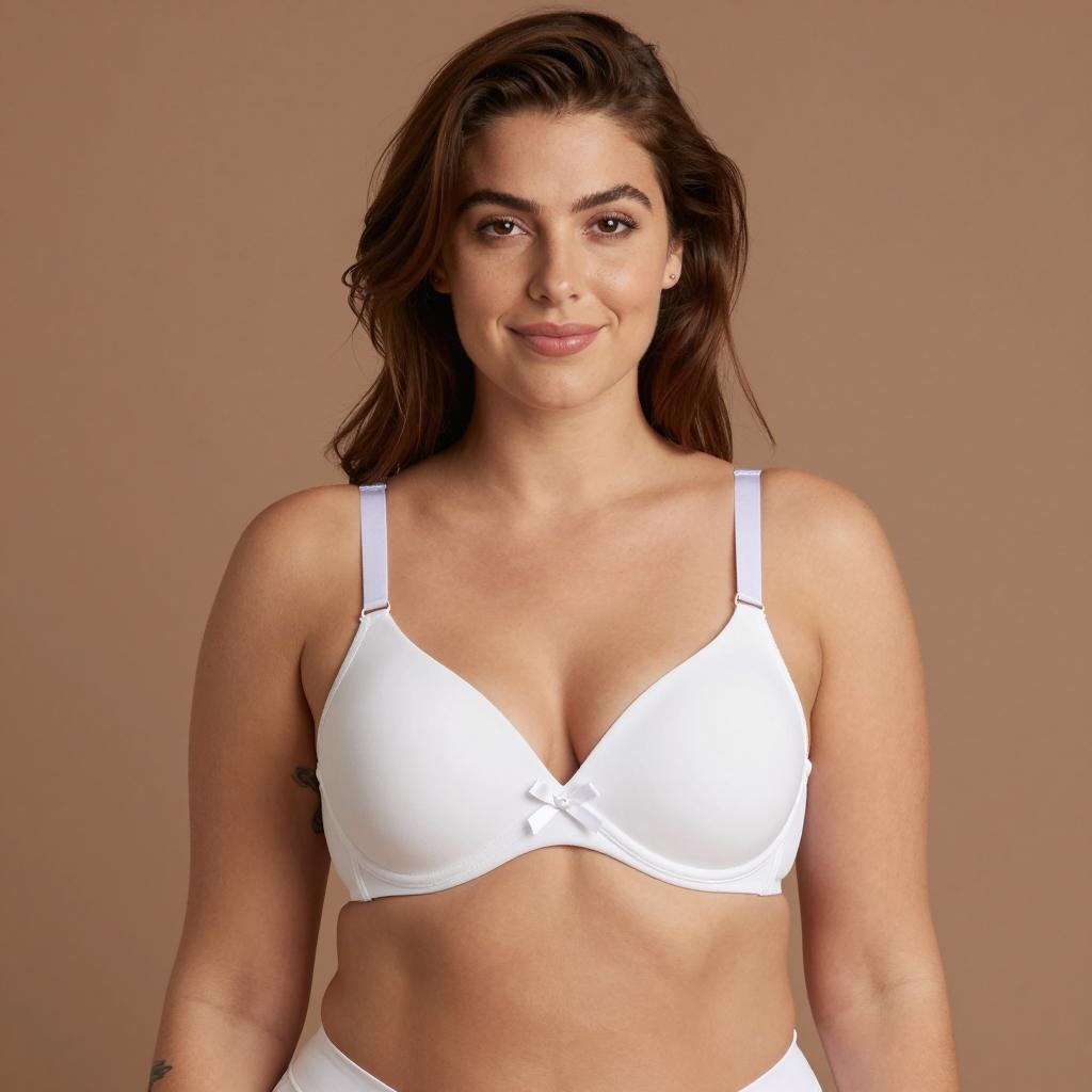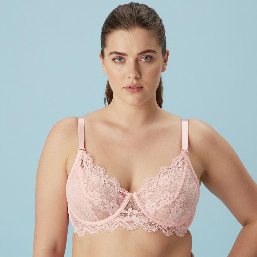 Photograph of a light-skinned woman with long, straight blonde hair, smiling slightly. She wears a light blue bra with white straps, revealing medium-sized breasts. She stands against a solid pink background. Her right arm is slightly raised.