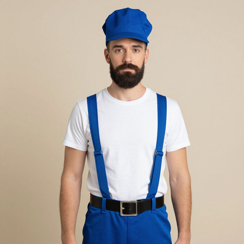 Plumber fancy dress costume, 1boy, male focus, solo, hat, facial hair, realistic, belt, beard