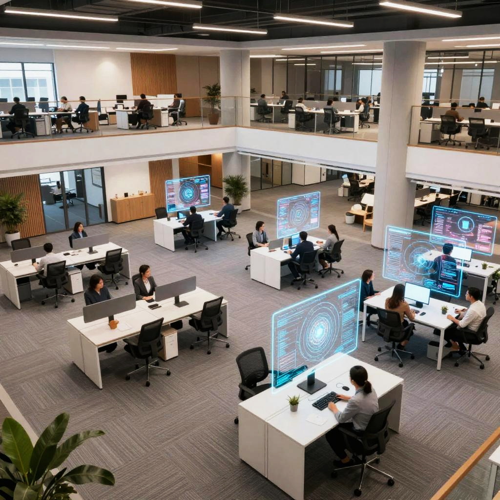 AI floorplan of a high-tech office building interior, integrating dynamic workspace solutions, modular furniture, holographic displays, and ergonomic layouts, displayed in a photorealistic style focusing on airflow, lighting, and digital connectivity in a professional environment.