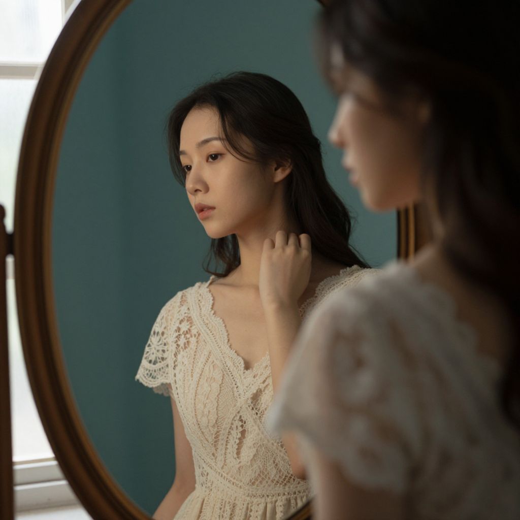 Photograph of an East Asian woman with long black hair, wearing a cream-colored, lace, V-neck dress, standing in front of a round mirror. She is gazing at her reflection, with her right hand gently touching her neck. The background is a softly lit room with teal walls and a window allowing natural light to filter in. The mirror's wooden frame is visible on the left side. The woman's expression is contemplative, with a subtle, pensive look. The image focuses on her reflection, creating a sense of introspection.
